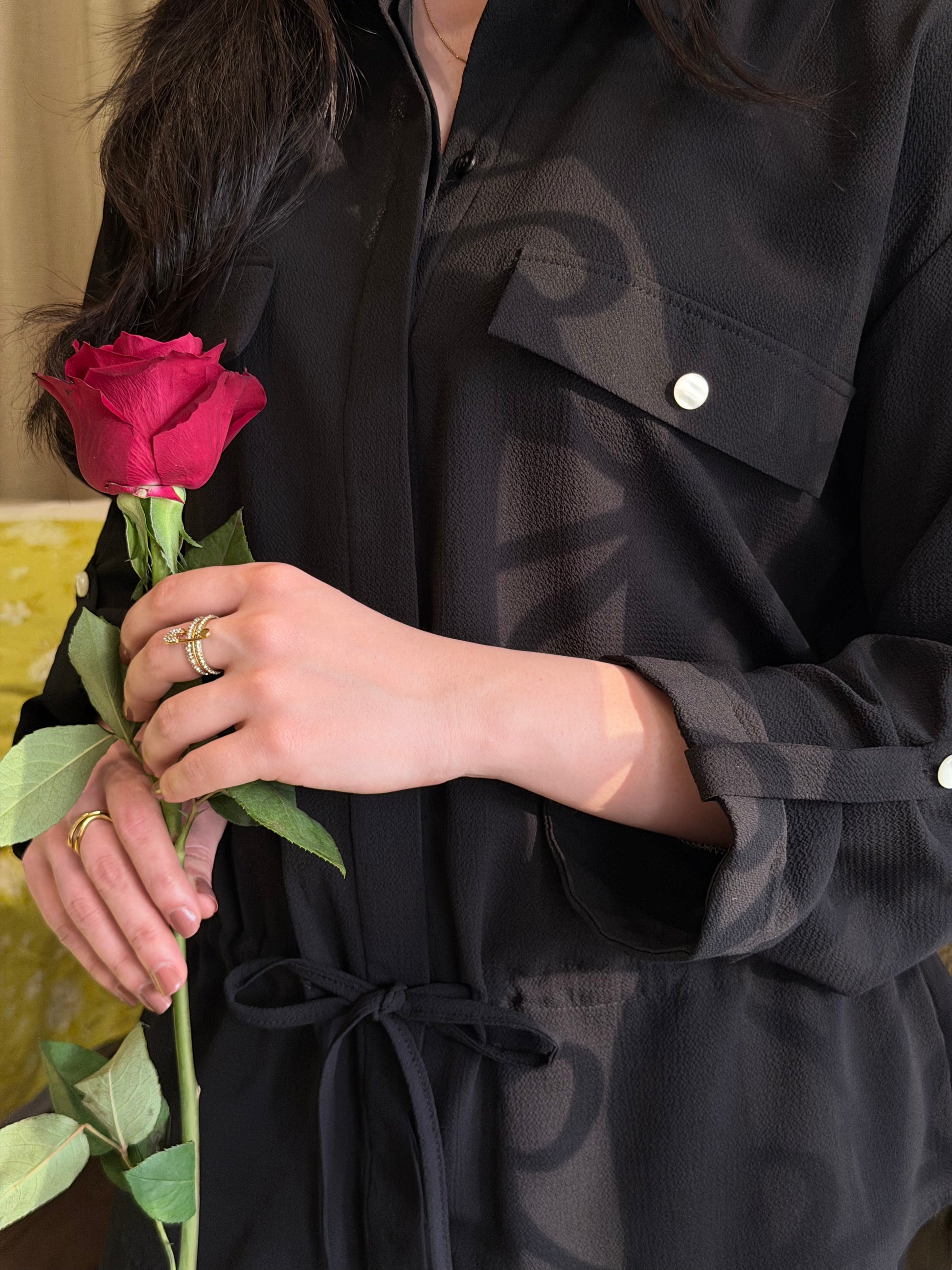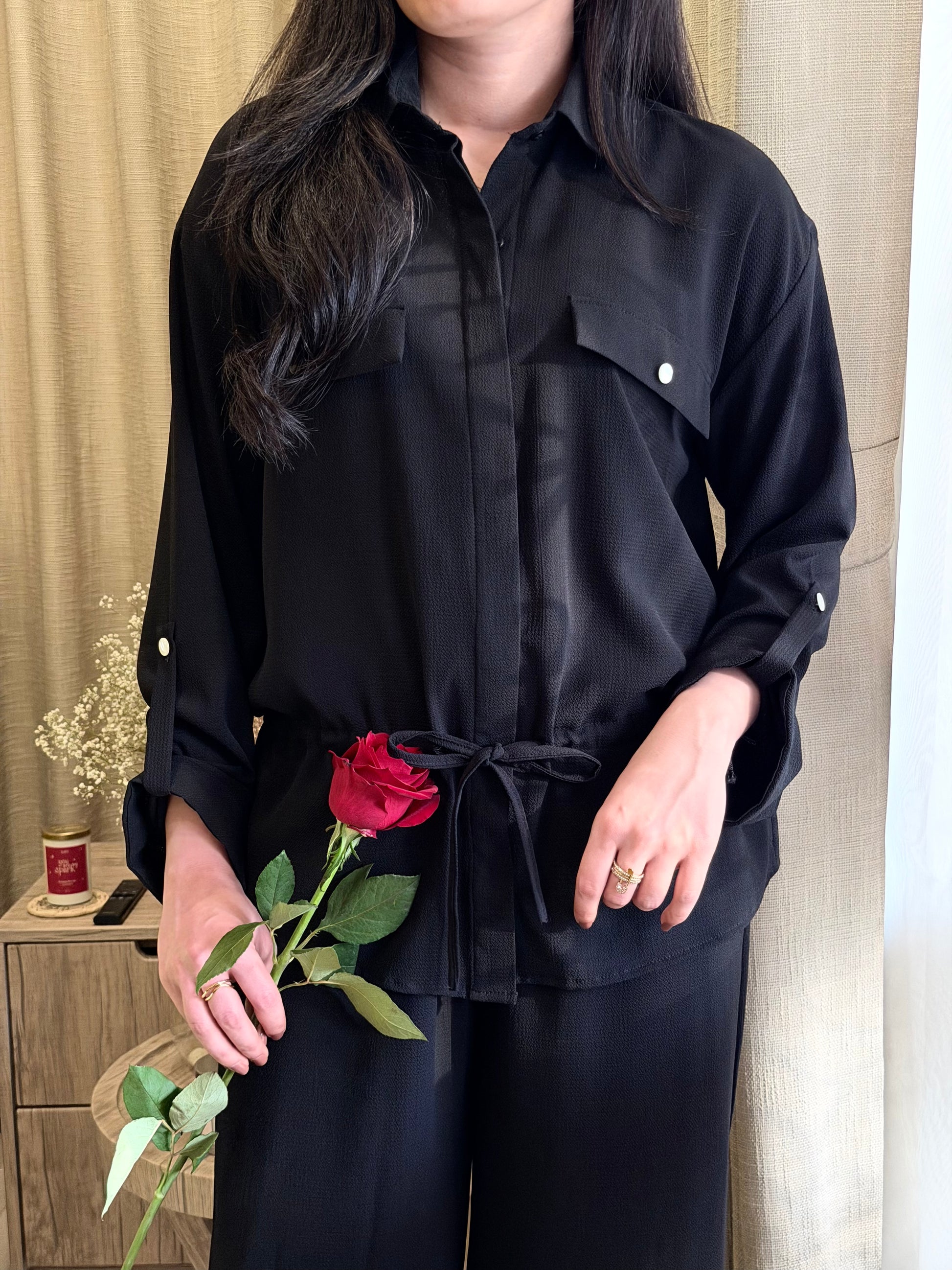A classy black two-piece outfit featuring a relaxed button up shirt with front flaps and roll-up sleeves, paired with straight wide bottoms The adjustable drawstring at the waist gives a nice cinched shape and flattering fit.
